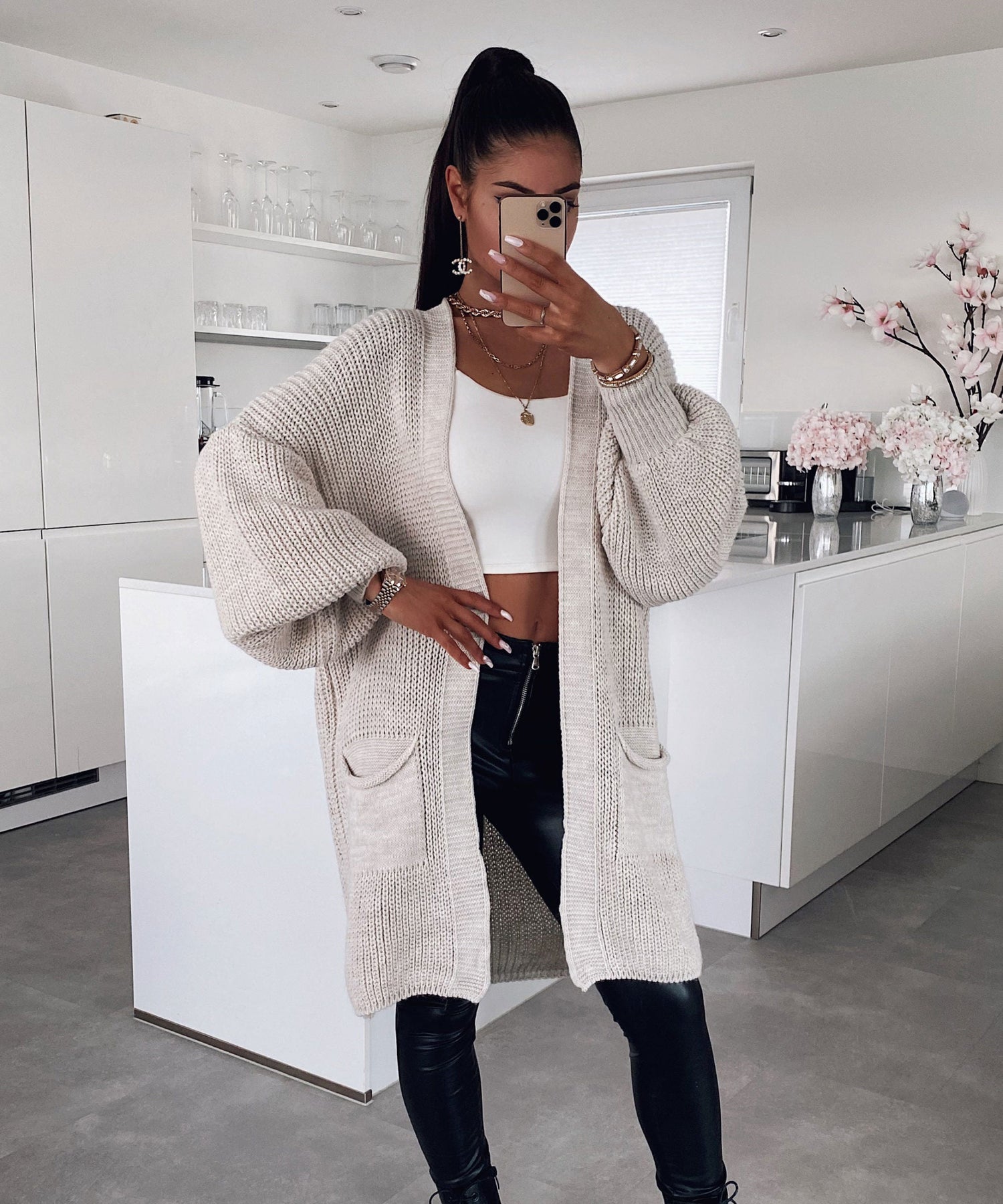 Oversized chunky knit cardigan designed for effortless layering and maximum comfort. Crafted in one size to flatter different body types, it drapes naturally for a cozy yet stylish silhouette. One size fits UK8/14 - S/XL.