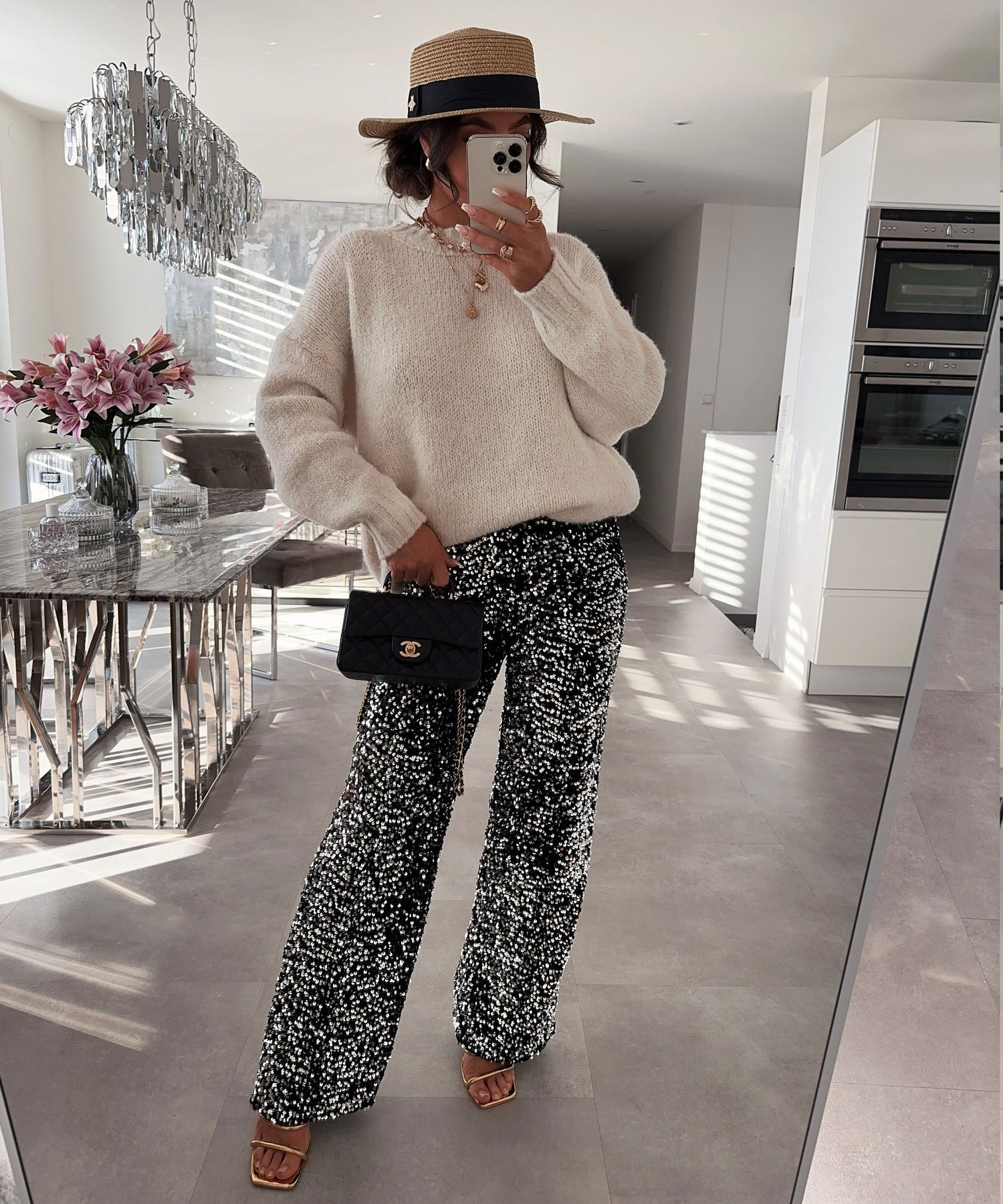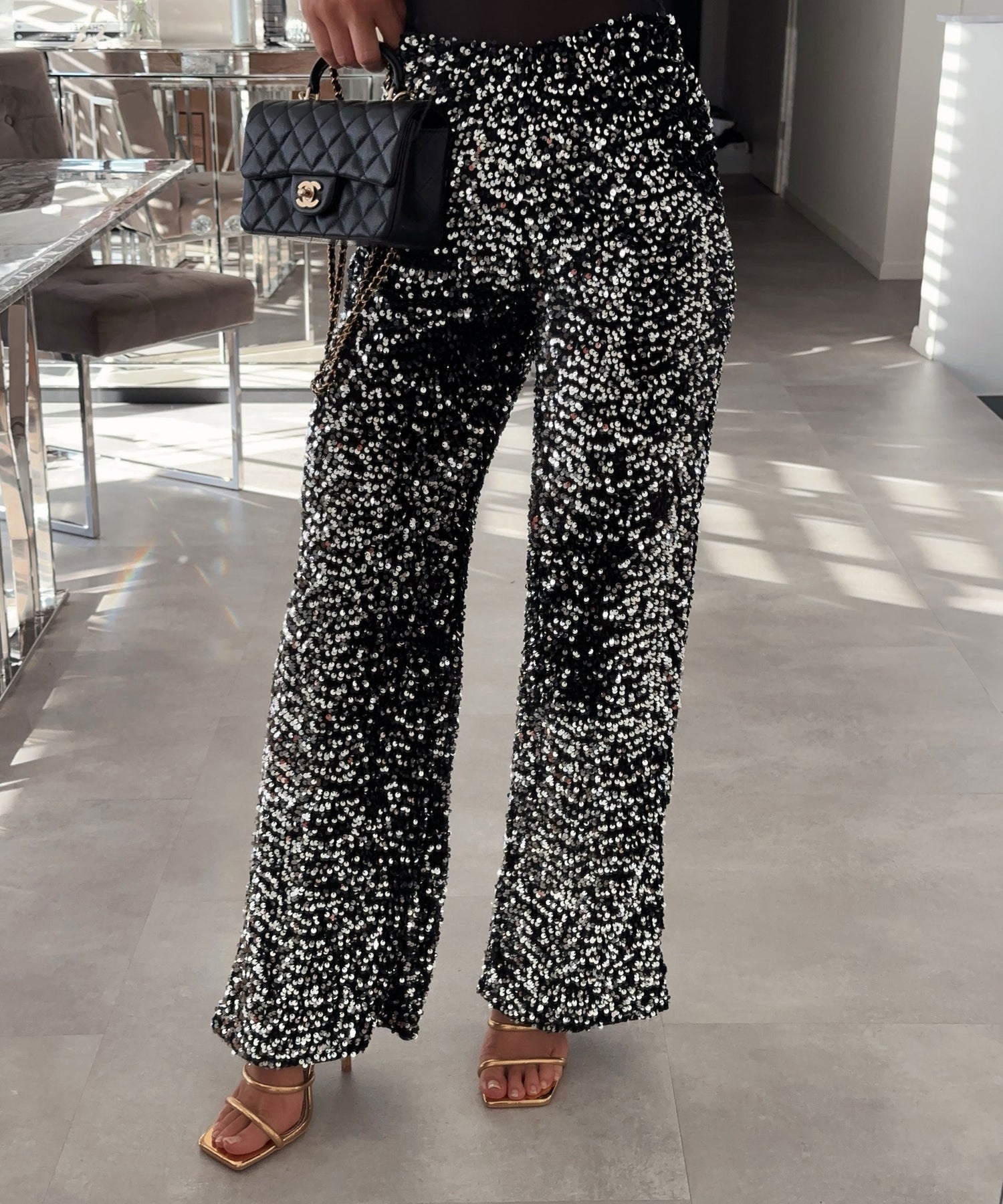 These pants catch the light beautifully without feeling gaudy. Bold, elegant, and fun, a statement piece.