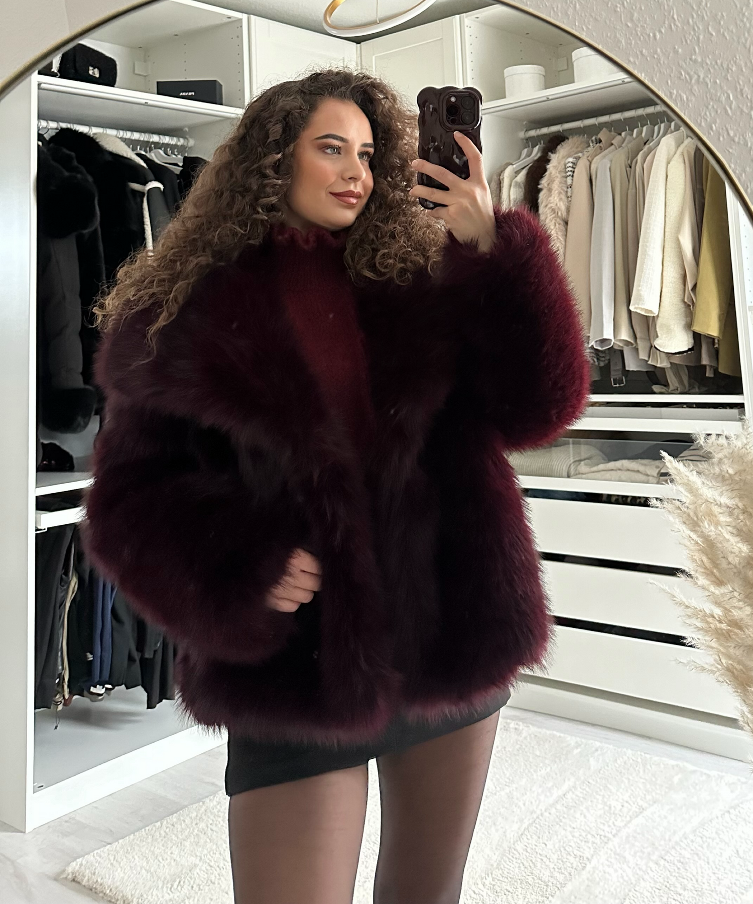 This deep wine faux fur coat turns every cold day into a statement moment — bold, soft and effortlessly chic.