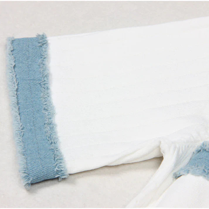 Meet Selin, your new everyday midi that marries classic sophistication with a cool, contemporary twist. Crafted in a soft rib-knit with subtle eyelet texture, this dress skims the body in all the right places. Short sleeves, a crew neckline and front button-through placket are finished with frayed denim-blue trim for that signature contrast. Two mock flap pockets at the bust complete the look—ideal for everything from coffee dates to after-work cocktails.