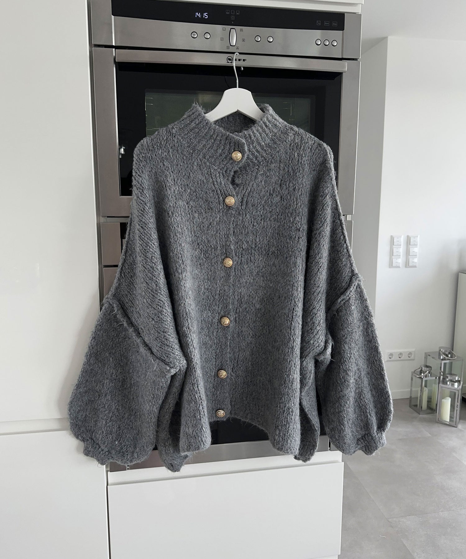 The perfect piece to stay stylish and cosy through winter. Beautiful knit cardigan with elegant gold buttons in an oversized look, made from an extremely soft fabric — model is 165 cm and wears size UK 10 - M.