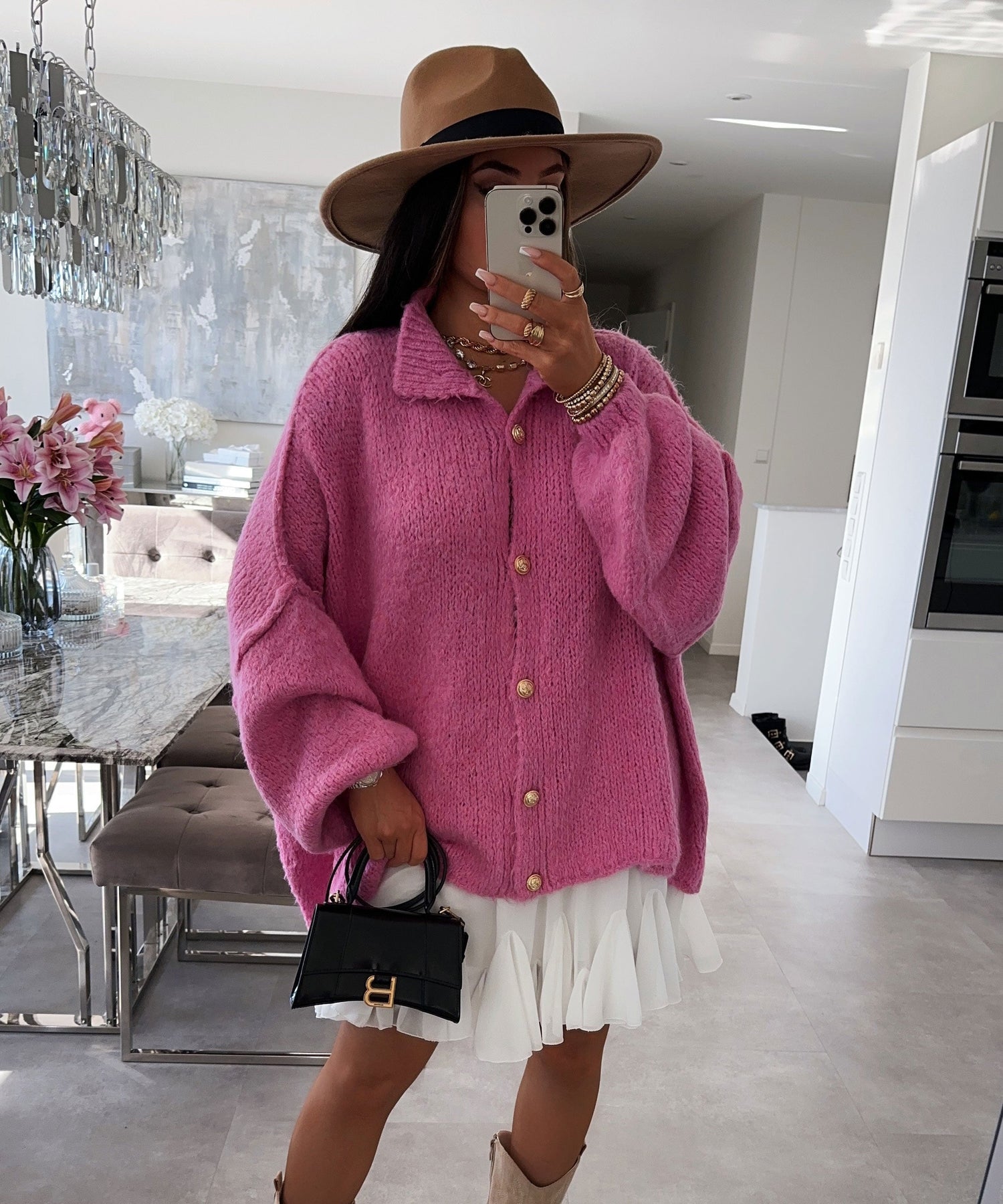 Oversized knitted cardigan with elegant gold buttons, crafted for warmth and effortless statement styling. Relaxed oversized cut. One size fits UK8/14 - S/XL.