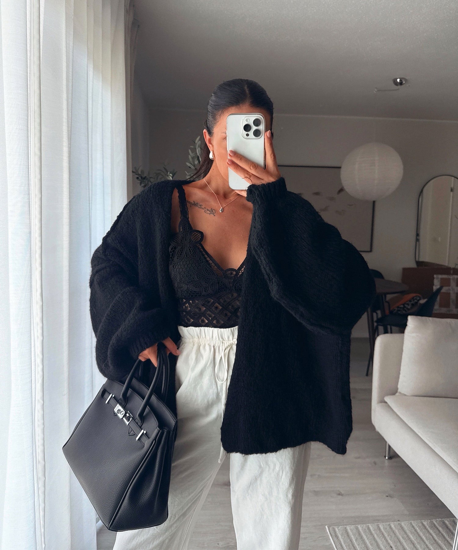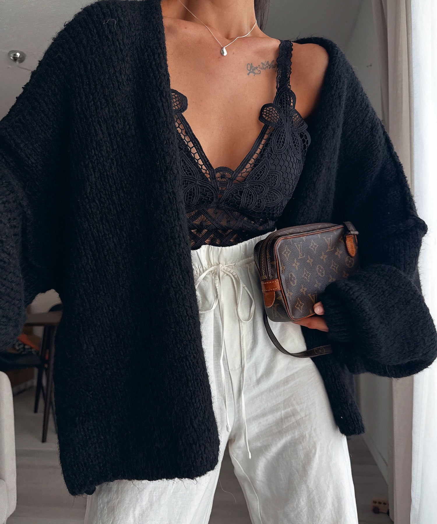 Oversized knitted cardigan in deep black, designed to keep you warm, cozy, and effortlessly stylish. Relaxed silhouette with dropped shoulders for a laid-back fit. One size fits UK8/14 - S/XL.